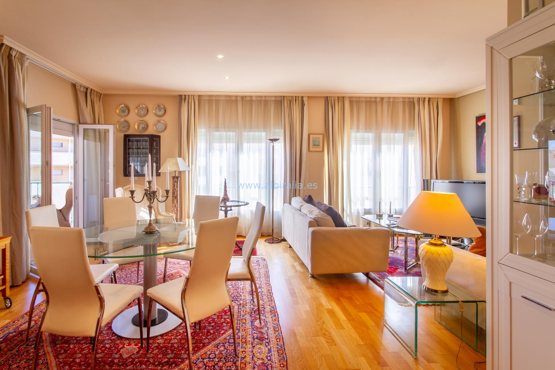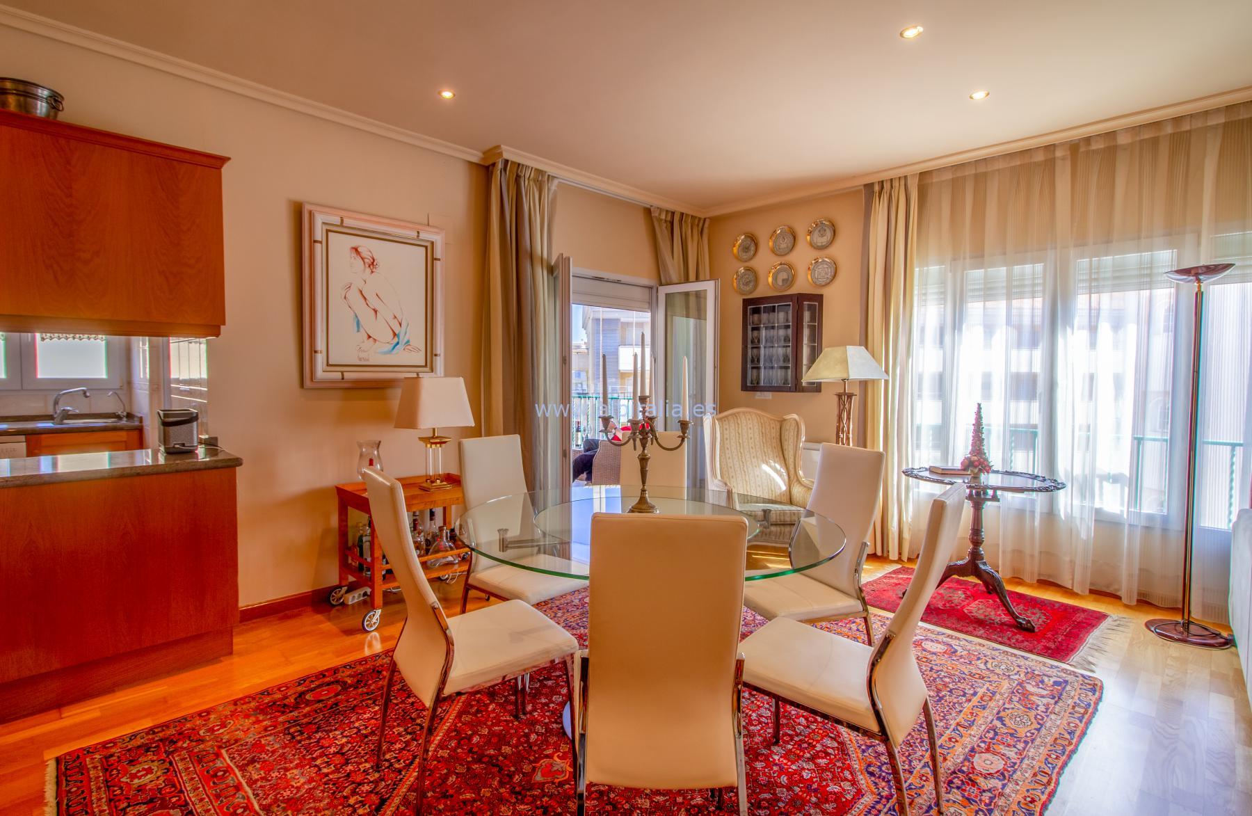 Inside, this penthouse apartment exudes allure and features a luminous and roomy living area that connects seamlessly to a delightful enclosed terrace. The practical and fully equipped kitchen, complete with a laundry room, is both aesthetically pleasing and functional. The apartment comprises three well-appointed bedrooms with built-in wardrobes, two pleasant bathrooms, and a convenient entrance hall. The generously sized master bedroom is flooded with natural light and offers an en-suite bathroom for added convenience.